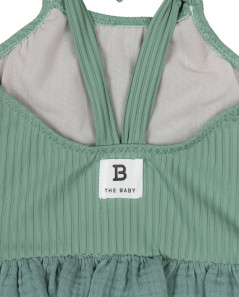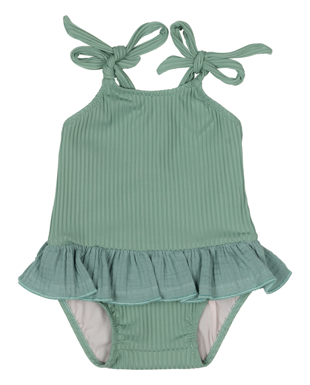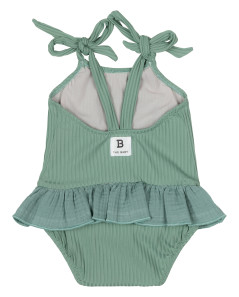 Bañador de canalé elástico con tirantes ajustables mediante lazada. Volante en la cintura en tejido de muselina a juego.
