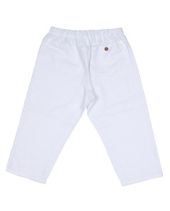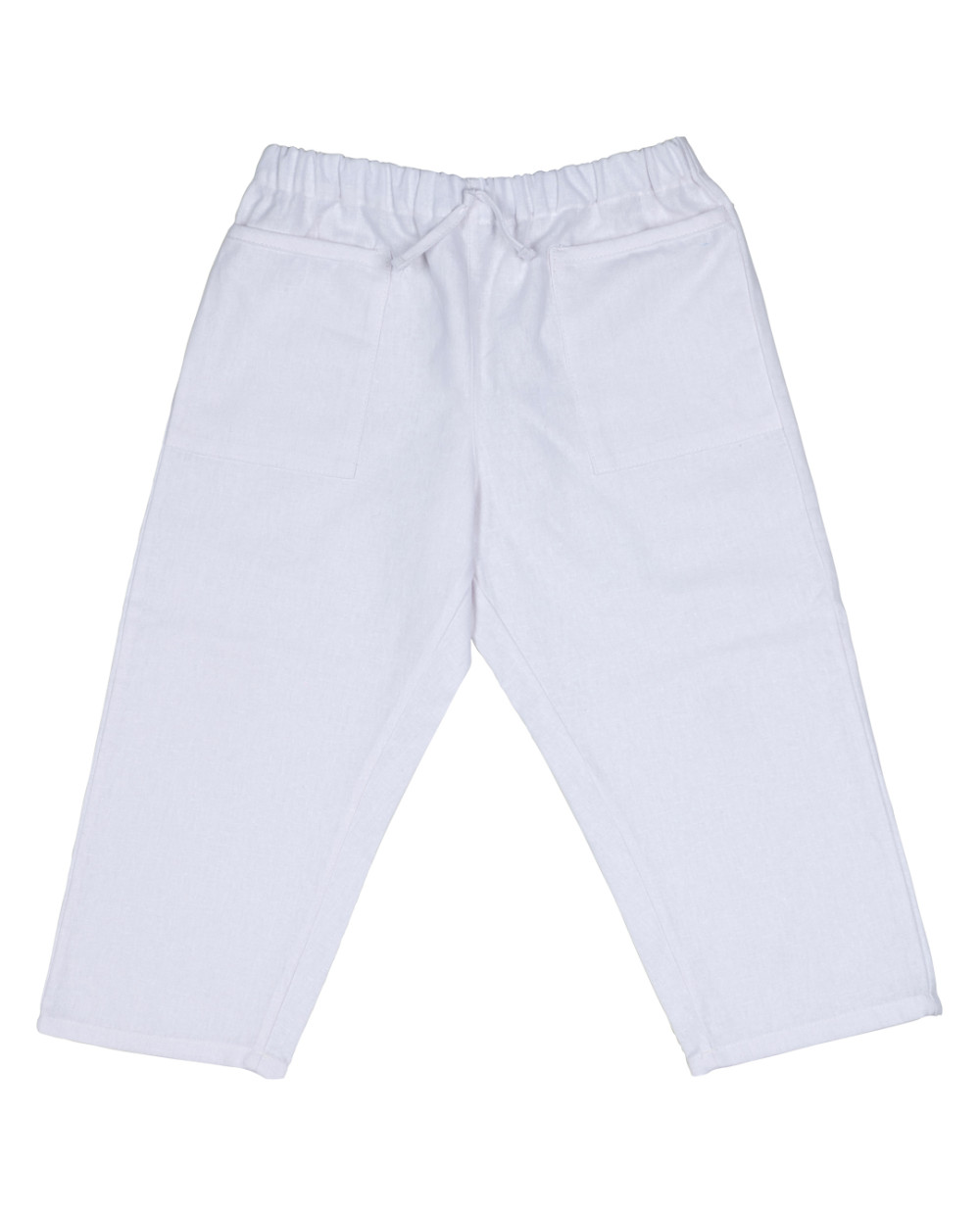 Pantalón largo de algodón y lino con cintura elástica. Dos bolsillos frontales y lazada decorativa en el centro de la cintura.