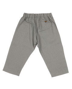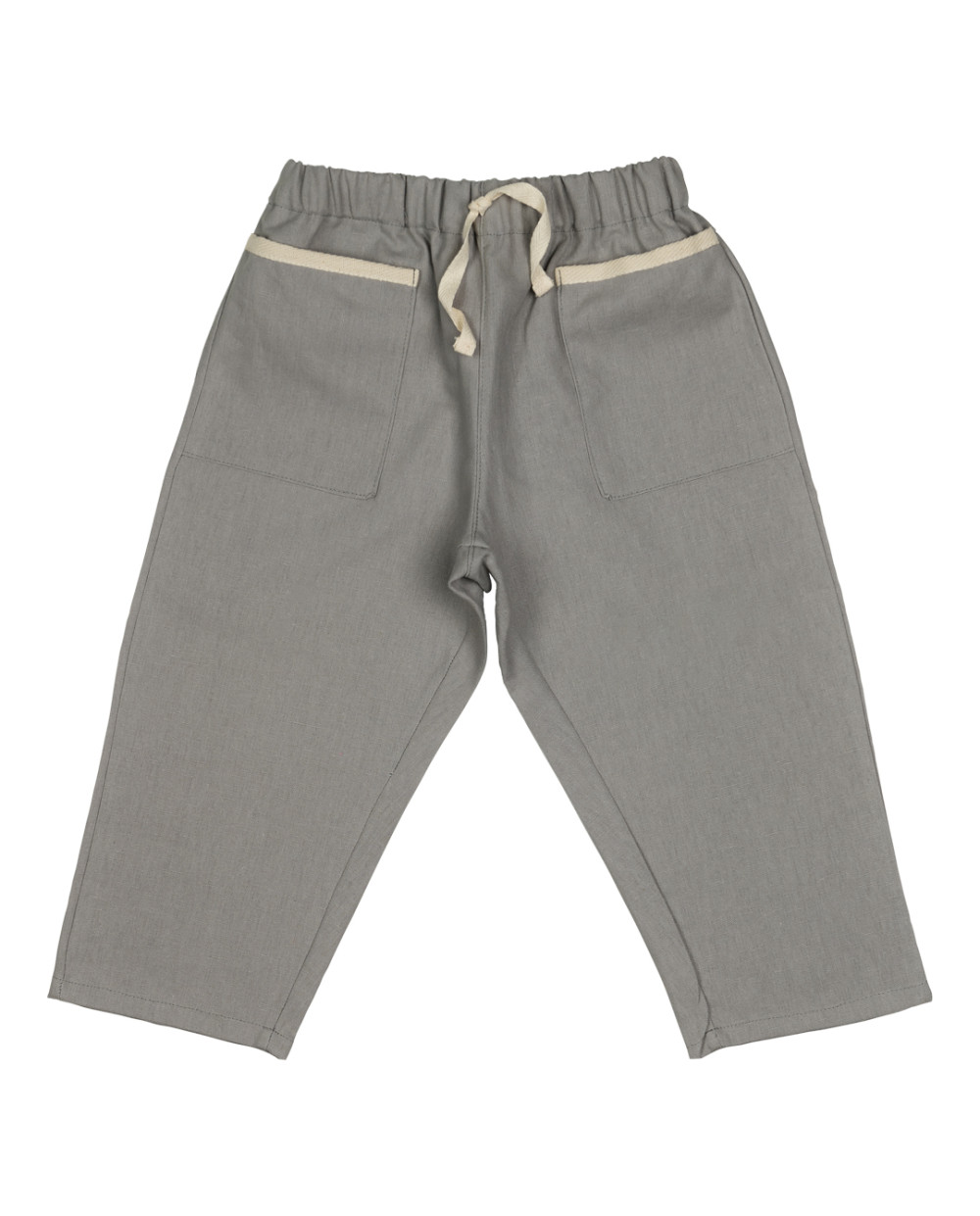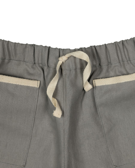 Pantalón largo de algodón y lino con cintura elástica. Dos bolsillos frontales y lazada decorativa en el centro de la cintura.